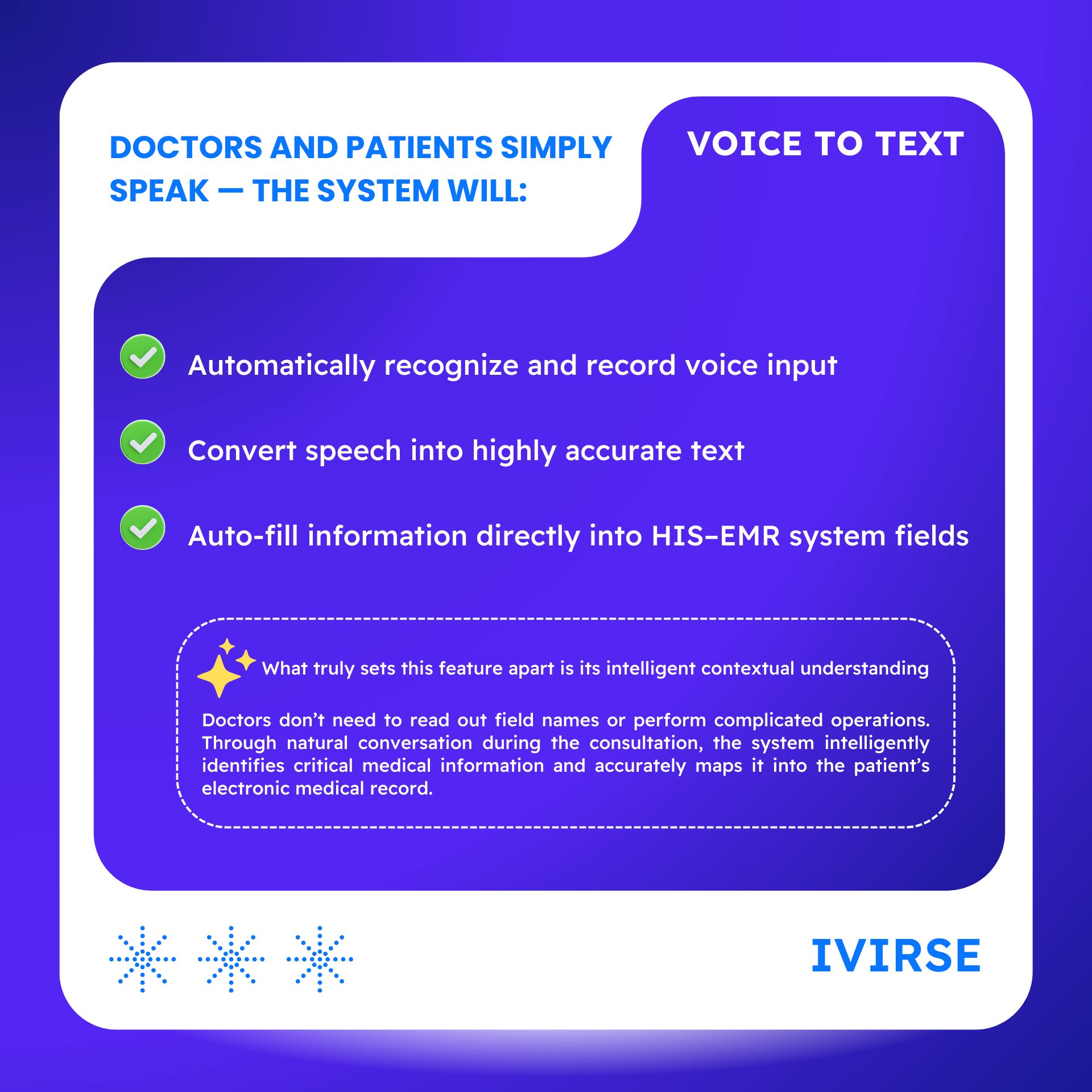 IVIRSE’s Voice To Text Bot is developed to support real-time clinical data capture during conversations, contributing to a more seamless and efficient digitization of healthcare documentation.